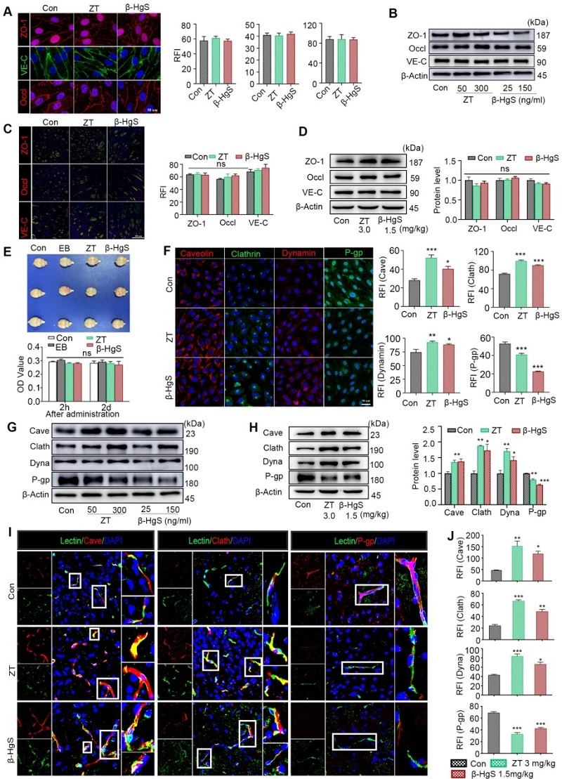 通過細胞蛋白組學分析結(jié)合體內(nèi)外蛋白驗證,初步證實金屬制劑主要通過調(diào)節(jié)血腦屏障中的轉(zhuǎn)胞吞作用實現(xiàn)高效的跨腦遞藥功能。它能夠通過上調(diào)腦微血管中caveolin,clathrin,和 dynamin蛋白的表達促進藥物向腦內(nèi)轉(zhuǎn)運,同時顯著降低 P-gp的表達,以減少血腦屏障對藥物的外排作用,從而實現(xiàn)藥物在腦內(nèi)的高效富集。另外,值得關注的是,HgS金屬制劑并沒有引起血腦屏障緊密連接相關蛋白的表達降低,說明它對藥物的入腦作用并不是通過血腦屏障結(jié)構(gòu)的暫時性開放而實現(xiàn)的。