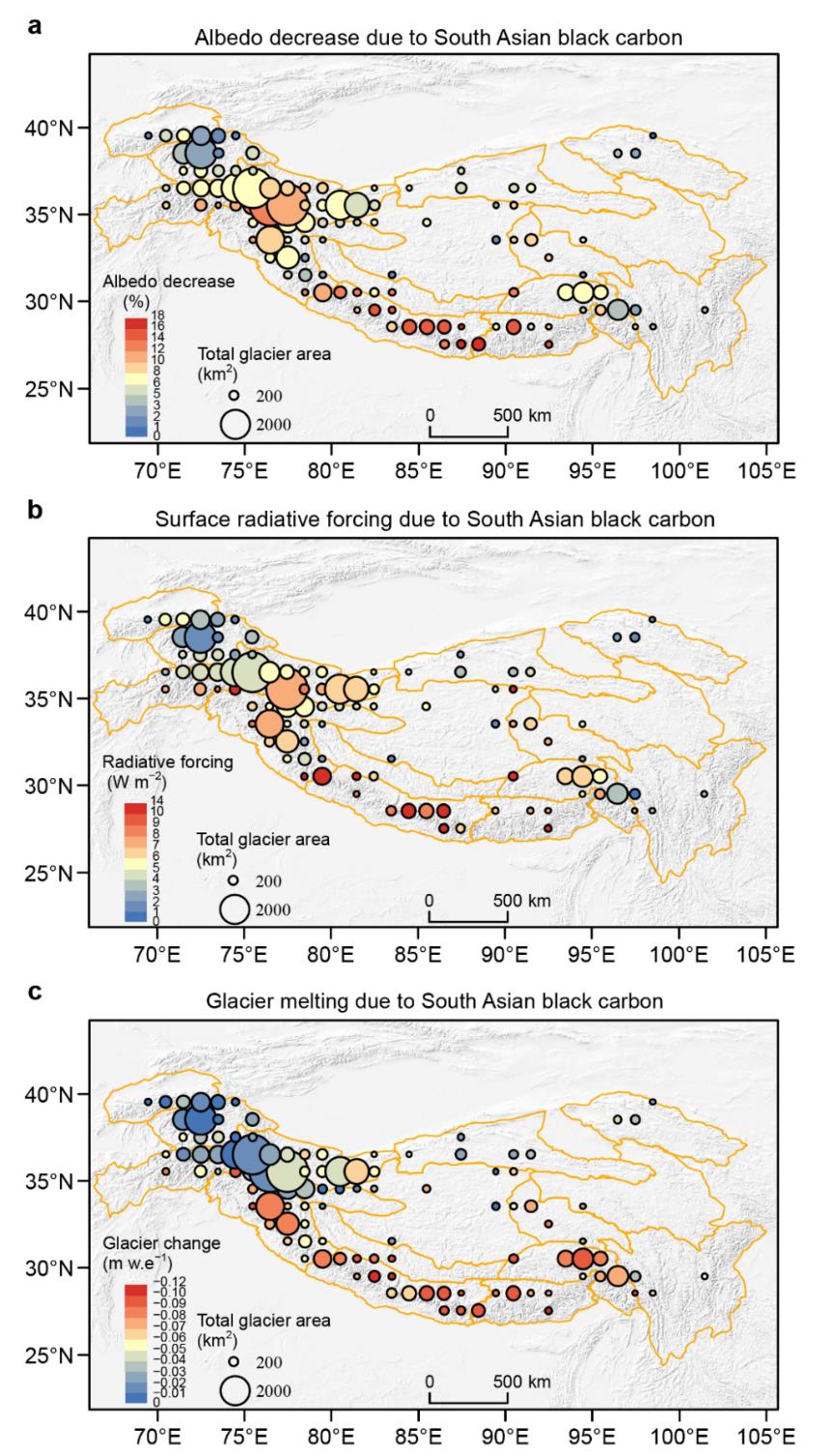 前期研究發(fā)現,南亞黑碳導致中高層大氣增溫,增強了區(qū)域對流活動,使得水汽在南亞輻合,黑碳增加了大氣中的云凝結核數量。黑碳引起的這些氣象條件變化,使得更多的水汽在南亞形成降水,由此傳輸到青藏高原的水汽減少,降水也隨之減少,進而導致青藏高原冰川的物質補給減少。在此基礎上,本研究在區(qū)域尺度上量化了南亞黑碳對高原冰川表面反照率和冰川消融的影響,進一步評估了南亞黑碳對青藏高原冰川變化的直接消融效應和間接降水補給效應,并深入探究其對流域水儲量的影響。