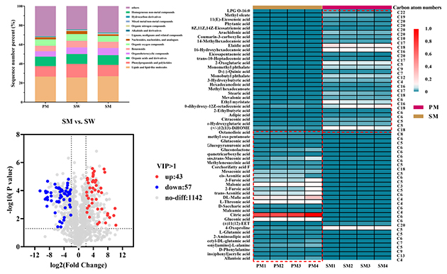 非靶向代謝組學(xué)分析共鑒定出1242種代謝物。在扁蓿豆植株甲醇提取物中,短鏈有機酸及其衍生物的相對豐度較高;根際土壤水提物中富含生物堿和黃酮類化合物;而根際土壤甲醇提取物則以長鏈有機酸及其衍生物為主。進一步發(fā)現(xiàn),短鏈有機酸、其衍生物以及黃酮類化合物可能為與扁蓿豆化感作用相關(guān)的關(guān)鍵候選化感物質(zhì)。