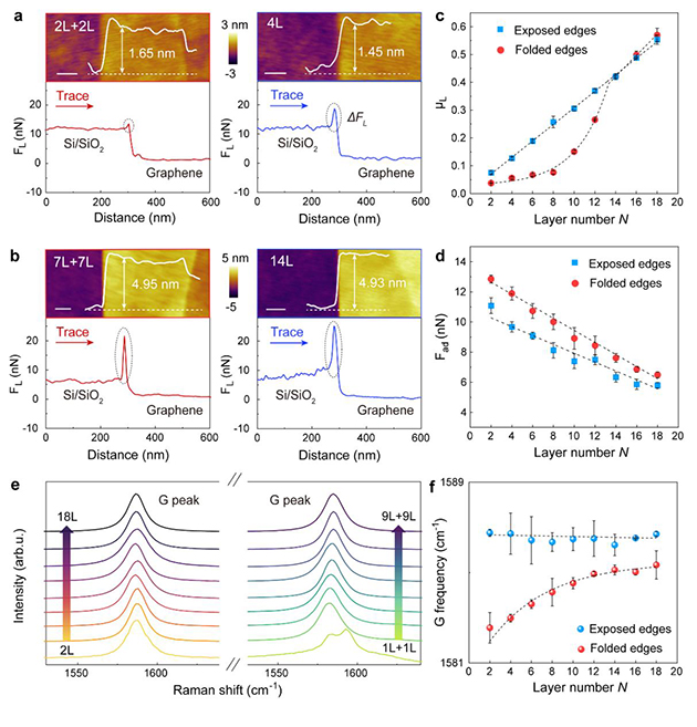 團(tuán)隊(duì)基于原子力顯微鏡納米針尖操縱技術(shù),構(gòu)筑了具有可控曲率與層數(shù)的折疊石墨烯邊緣拓?fù)浣Y(jié)構(gòu)(圖1),系統(tǒng)開(kāi)展了納米尺度摩擦測(cè)量。研究發(fā)現(xiàn),折疊石墨烯邊緣摩擦力隨層數(shù)呈現(xiàn)出顯著的非線性變化(圖2),違背了經(jīng)典摩擦定律在固-固界面下的適用性。