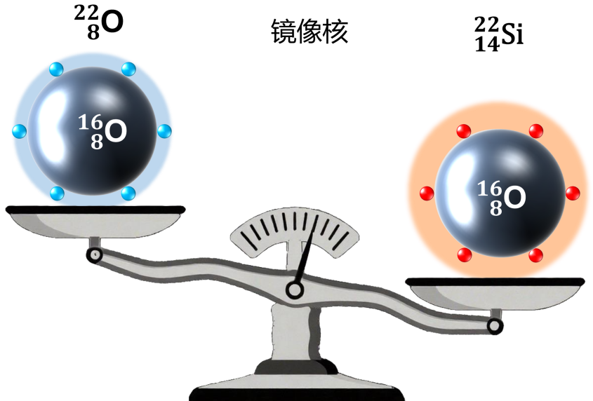 圖:硅-22及其鏡像核氧-22結(jié)構(gòu)示意圖。通過(guò)硅-22的質(zhì)量測(cè)量,結(jié)合理論計(jì)算,科研人員揭示了硅-22具有與氧-22相似的雙幻結(jié)構(gòu),但同時(shí)存在輕微的對(duì)稱(chēng)破缺,具有更外延的質(zhì)子空間分布。(圖源/近代物理所)