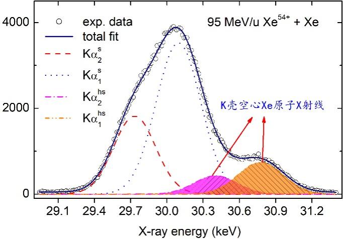 針對高效制備重空心原子并對其進行系統(tǒng)性研究的難題,科研團隊在蘭州重離子加速器冷卻儲存環(huán)(HIRFL-CSR)及其氣體內(nèi)靶裝置上開展了相關(guān)實驗,利用能量95-197 MeV/u的全裸氙離子與氙靶碰撞,測量了反應(yīng)后靶原子的X射線譜。研究發(fā)現(xiàn),得益于全裸氙離子所攜帶的強庫侖場及對稱碰撞中內(nèi)殼電子轉(zhuǎn)移過程,空心氙原子的相對產(chǎn)額相比K殼單空穴氙原子最高可達28.6%。該研究表明全裸重離子-原子碰撞是高產(chǎn)額制備重空心原子的有效途徑。