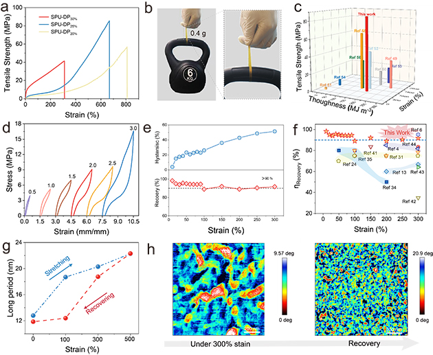 最后,研究人員通過機(jī)械性能測試證明,利用動態(tài)硬域精準(zhǔn)控制微相分離,成功實現(xiàn)了聚氨酯彈性體在力學(xué)性能上的調(diào)控,突破了長期以來高強(qiáng)度和高彈性無法兼容的瓶頸。調(diào)控優(yōu)化后的聚氨酯彈性體斷裂強(qiáng)度超過80MPa以上,該拉伸強(qiáng)度超過了目前已報道的大多數(shù)人工合成彈性體。此外,該優(yōu)化的聚氨酯彈性體在短程應(yīng)變下表現(xiàn)出超過90%的回彈效率,且在長程應(yīng)變下超過88%,該回彈效率也超過了目前所報道的大多人工合成彈性體,在短程變形時甚至可與生物彈性蛋白相媲美。