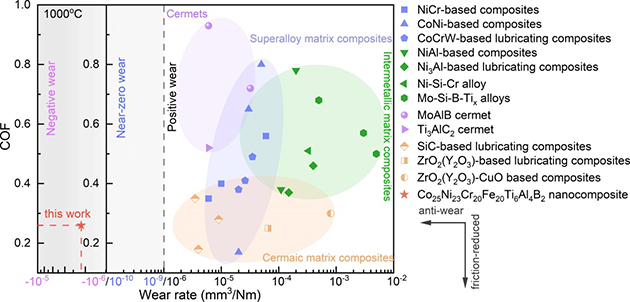 圖2. 各類已報(bào)道高性能抗磨材料在1000 ℃的摩擦學(xué)性能對比
