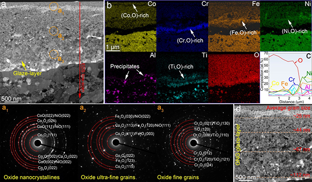 近日,中國科學(xué)院蘭州化學(xué)物理研究所潤滑材料全國重點(diǎn)實(shí)驗(yàn)室高溫摩擦學(xué)課題組與香港城市大學(xué)機(jī)械工程系先進(jìn)結(jié)構(gòu)材料課題組,在長期合作基礎(chǔ)上提出了一種基于晶體-非晶異質(zhì)結(jié)構(gòu)與梯度納米氧化層協(xié)同調(diào)控的高熵納米復(fù)合材料設(shè)計(jì)策略。團(tuán)隊(duì)設(shè)計(jì)制備了一種Co25Ni23Cr20Fe20Ti6Al4B2高熵納米復(fù)合材料,包含高密度Ti–O富集非晶納米析出相的多級異質(zhì)結(jié)構(gòu)。在1000 ℃和較高接觸應(yīng)力條件下,該材料表面原位生成微米級厚度的梯度納米釉質(zhì)層,其晶粒尺寸沿深度方向從表面25nm漸增至基體112nm,實(shí)現(xiàn)了應(yīng)變逐層協(xié)調(diào)與應(yīng)力有效緩解。得益于這一結(jié)構(gòu)演化,該材料在1000 °C實(shí)驗(yàn)中獲得了-2.3×10-6mm3/Nm的穩(wěn)定負(fù)磨損率與0.26的低摩擦系數(shù),刷新了金屬基抗磨材料的高溫性能紀(jì)錄。