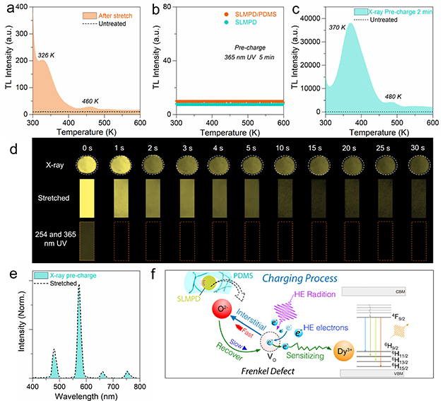 圖1.?SLMPD/PDMS在紫外輻照、X射線輻照和拉伸刺激前后的光譜對(duì)比,以及界面高能輻射缺陷物理機(jī)制。