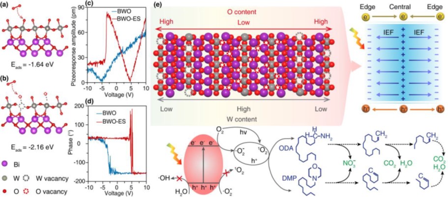 中國科學院青海鹽湖研究所輕合金與稀散元素分離課題組根據(jù)鉀鹽浮選藥劑性質特點,聚焦綠色高效處理的研究需要,結合高原地區(qū)自然光輻照強度大等優(yōu)勢,優(yōu)化光催化材料缺陷工程改性策略,成功制備金屬/非金屬雙缺陷鉍酸鹽光催化材料,考察其對可見光的吸收利用,并對雙缺陷結構改性鉍酸鹽光催化劑的催化作用機制開展深入剖析。研究發(fā)現(xiàn),在水熱制備Bi2WO6過程中加入適當比例的還原劑(EG)和刻蝕劑(NaOH),可以實現(xiàn)“一鍋法”在Bi2WO6納米片的中心和邊緣區(qū)域分別構筑O缺陷和W缺陷,強化提升鉍酸鹽的催化性能。機理研究發(fā)現(xiàn):在雙缺陷結構材料(BWO-ES)中,W缺陷作為負電荷中心,O缺陷充當局部的正電荷中心。當這些帶相反電荷的缺陷在晶格不同位置建立時,使Bi2WO6材料的靜電偶極距由本體材料(BWO)的1.54 D提升至BWO-ES的48.15 D,促使材料的內建電場強度提升2.74倍,為光生電子-空穴對的有效分離提供了內部驅動力,從而抑制光生載流子的復合,表現(xiàn)的瞬態(tài)熒光壽命由BWO的1.61 ns提升至BWO-ES的2.63 ns。此外,O缺陷的構筑降低了材料的帶隙(2.78 ev→2.54 eV),拓展了材料的光響應范圍(446 nm→488 nm)。在可見光(λ≥400 nm)照射下,BWO-ES對十八胺(ODA)和十二烷基嗎啉(DMP)的降解速率分別達到13.31 mg/L·h和14.40 mg/L·h,是本體BWO材料降解速率的3.64倍和3.59倍,可實現(xiàn)鹽溶液中ODA、DMP的完全礦化。