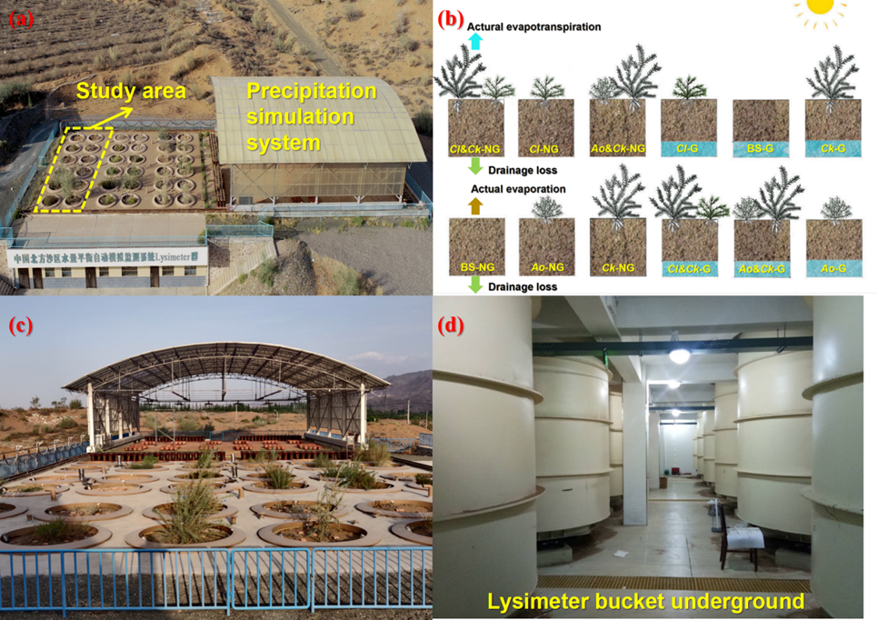 中國科學(xué)院西北生態(tài)環(huán)境資源研究院張志山研究員團(tuán)隊,依托沙坡頭沙漠研究試驗站的“中國北方沙區(qū)水量平衡自動模擬監(jiān)測系統(tǒng)——沙坡頭蒸滲儀(Lysimeter)群”,采用其中12個大型稱重式蒸滲儀(填充土壤為騰格里沙漠的風(fēng)沙土,從裸沙到多種單一栽植及灌木與半灌木混合栽植),系統(tǒng)量化了2019年至2023年間不同沙漠生態(tài)系統(tǒng)(有無地下水)的水量平衡組分及植物生長動態(tài)。