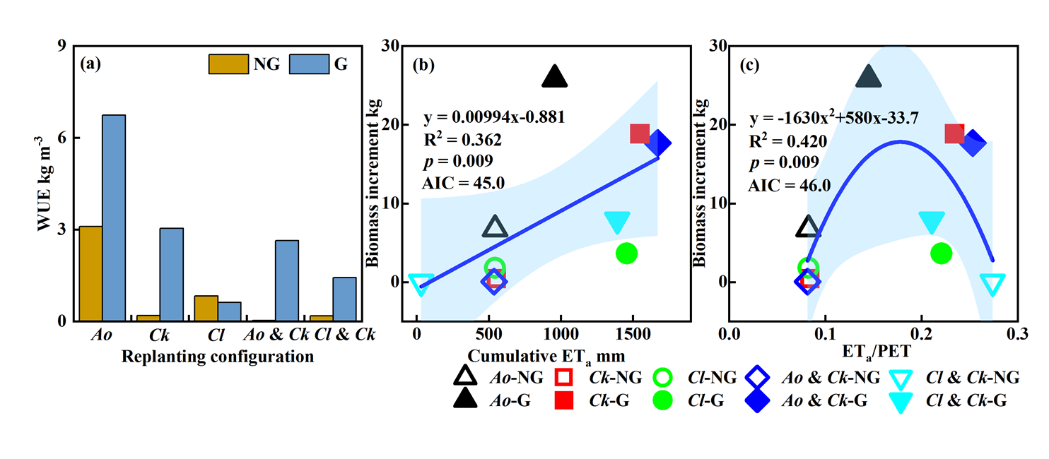 2020-2023年兩種地下水條件及不同植物配置下的水分利用效率(a),以及植物生物量增量變化與累積實(shí)際蒸散量 (b)和ETa/PET(c) 的關(guān)系。藍(lán)色陰影表示95%置信區(qū)間,PET:潛在蒸散發(fā)。