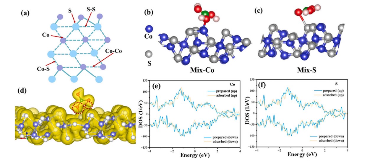 圖2.(a)ZIF-67衍生Co3S4中空吸附劑的吸附位點示意圖;(b-c)H3BO3在Co?S?上最穩(wěn)定的結構(Co和S位點);(e,f)不同位點Co?S?吸附H3BO3的DOS圖。