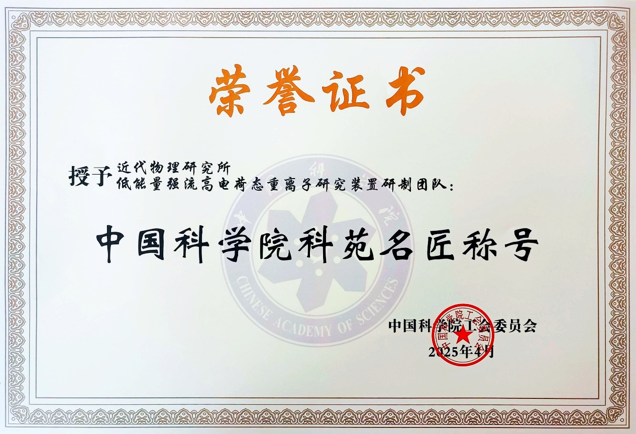 近代物理所低能量強(qiáng)流高電荷態(tài)重離子研究裝置研制團(tuán)隊(duì)榮獲中國科學(xué)院第六屆“科苑名匠”稱號(hào)