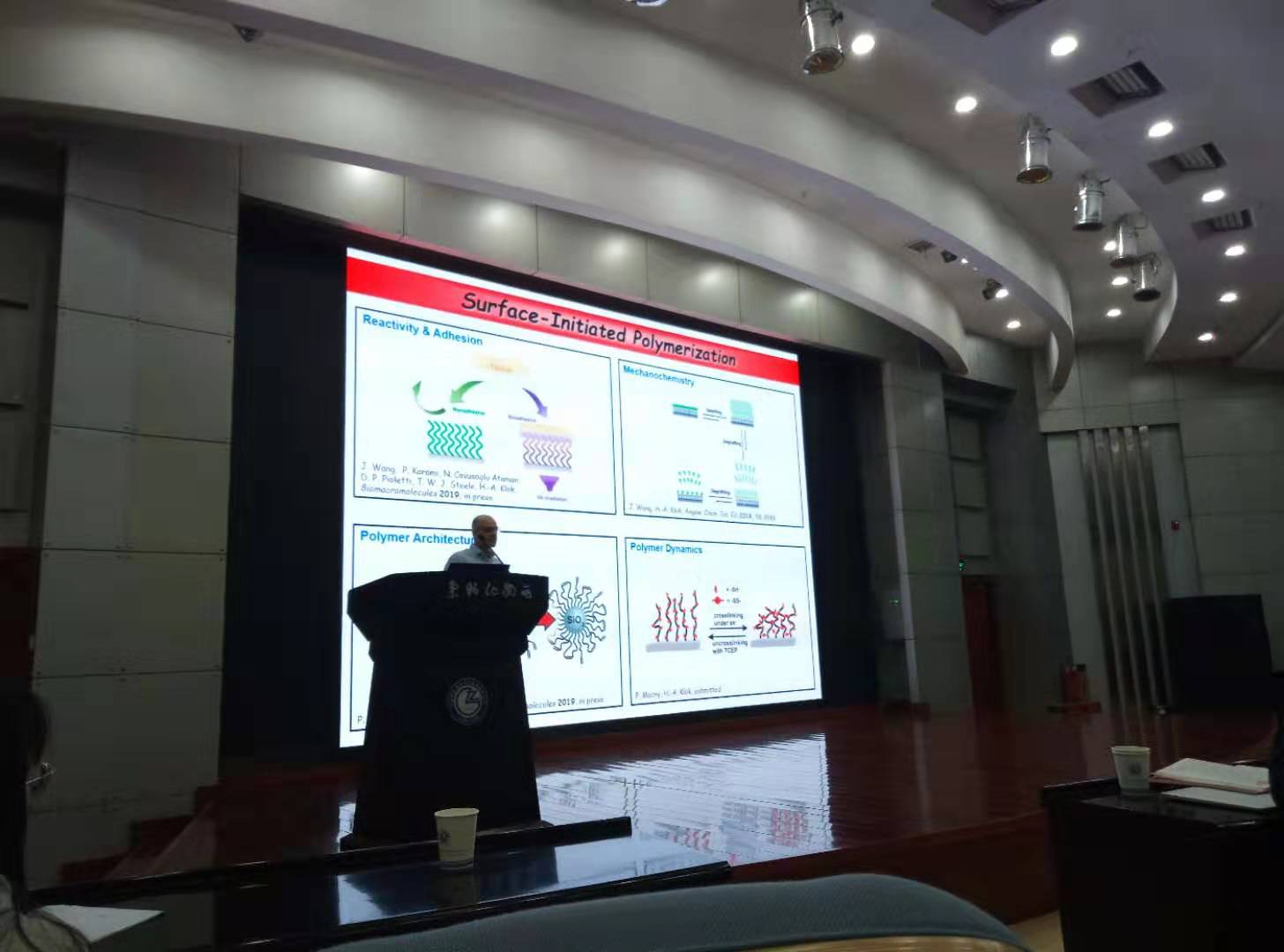 Harm-Anton Klok教授以表面引發(fā)聚合物刷接枝為切入點,重點介紹了UV輔助的組織黏附、溶脹引發(fā)的聚合物刷去接枝、納米球表面修飾以及聚合物刷動態(tài)交聯(lián)/去交聯(lián)等方面研究工作。報告結束后,Klok教授與大家就相關問題展開了討論參觀了固體潤滑國家重點實驗室,并聽取了實驗室部分老師近期工作介紹。