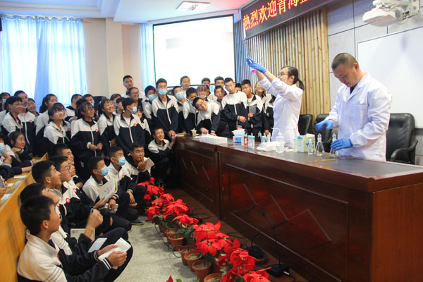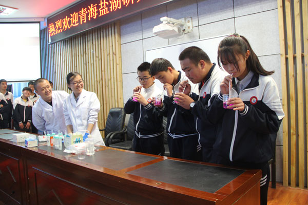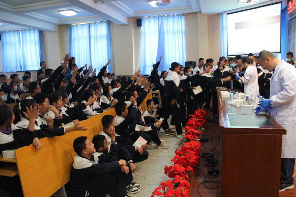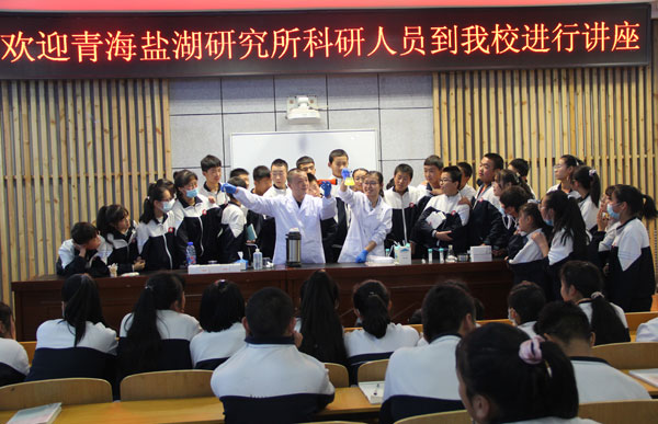 在校園,青海鹽湖所的博士科普團隊為中學(xué)生們講述了鹽湖故事,在《中國的鹽湖》科普講座中,形象生動地講述了“什么是鹽湖”“鹽湖在哪里”“鹽湖里有什么用”,使同學(xué)們對青海的特色優(yōu)勢鹽湖資源有了初步的認識;開展了神奇的化學(xué)小實驗,通過多彩化學(xué)、密碼顯形、黃金雨、催化放氧、銅樹銀枝、銀鏡反應(yīng)等一系列精彩的科普實驗,緊緊抓住“變化”這一核心,以極具震撼力的方式向同學(xué)們展示了化學(xué)之美和科學(xué)之美,為同學(xué)們開啟科學(xué)世界的大門,激起他們探索科學(xué)世界的興趣;醫(yī)療專家為同學(xué)們現(xiàn)場普及家庭急救知識和新冠疫情預(yù)防知識,現(xiàn)場演示了心肺復(fù)蘇方法、正確的洗手方法及注意事項。無論是小實驗還是急救現(xiàn)場演示,同學(xué)們踴躍主動,興致勃勃,教室里不時發(fā)出陣陣驚嘆聲和掌聲,活動取得了圓滿成功。